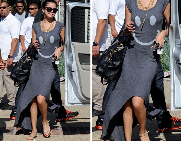 Selena usou um vestido longo mullet, tipo de roupa curta na frente e mais longa atrás, uma modelagem diferente, e que também ultimamente esta muito em alta no mundo da moda, assim como as saias mullets. O vestido tem uma estampa de um rostinho feliz, o que tornou algo mais descontraído.