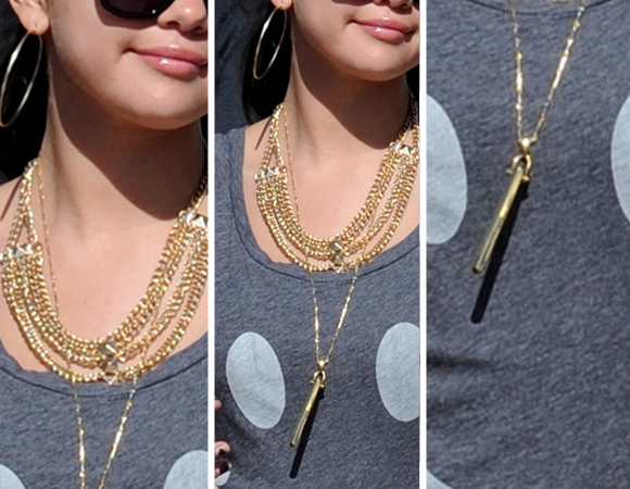 Para completar, dando um pouco mais de charme, Selena usou colares dourados. Um com várias correntes, Studded Multi-Chain, da marca Forever 21.
